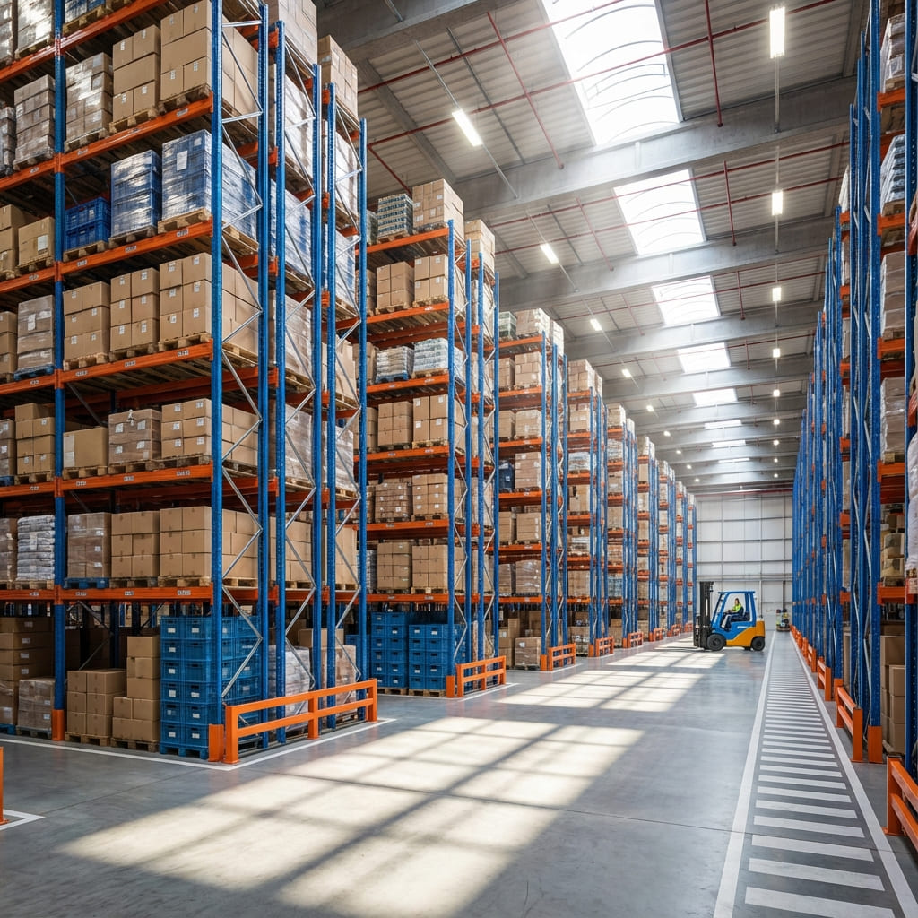 Rak gudang industri dengan kapasitas 800-2.000 kg per level. Ideal untuk pallet racking dengan forklift di gudang logistik berskala besar.